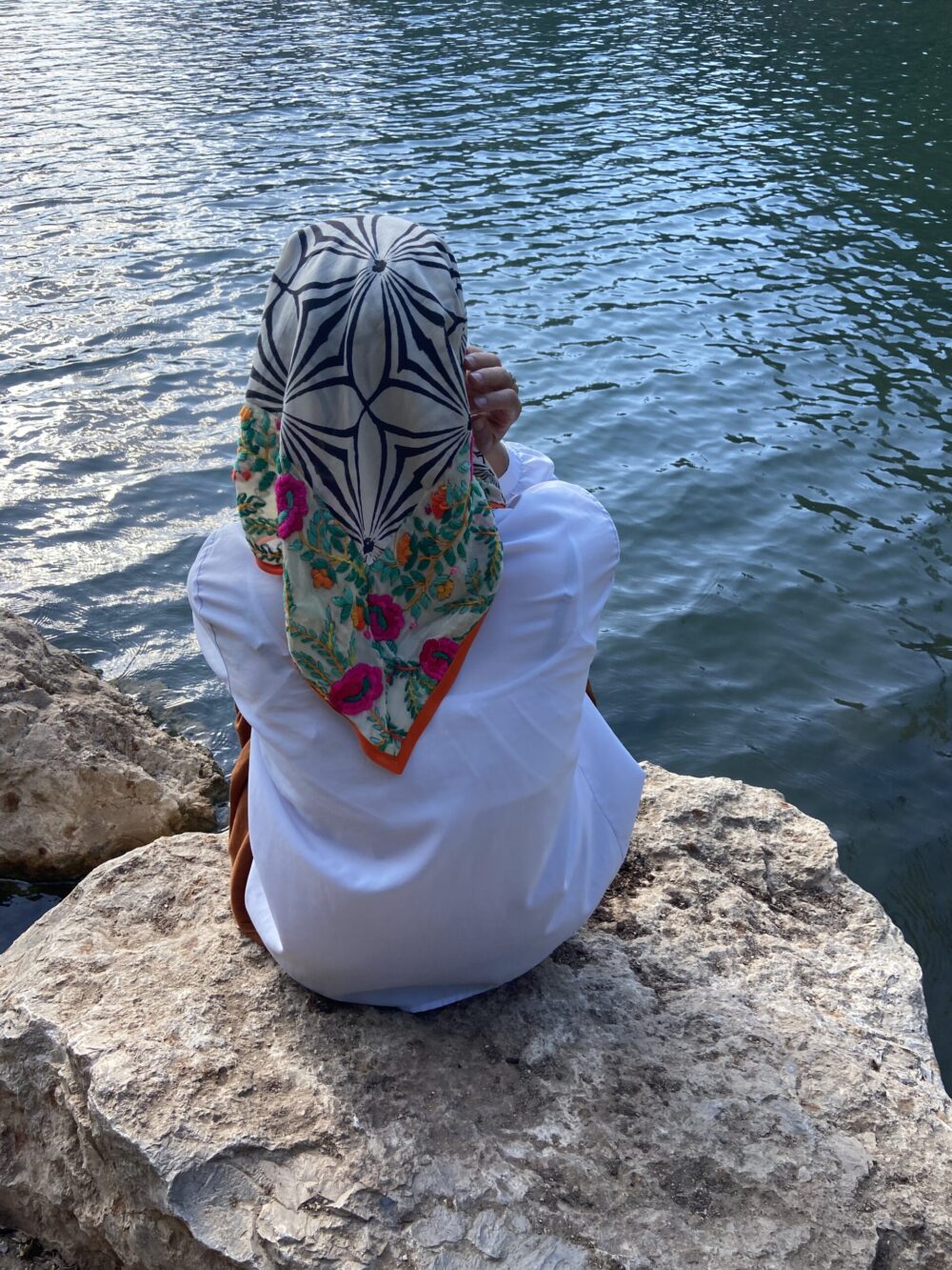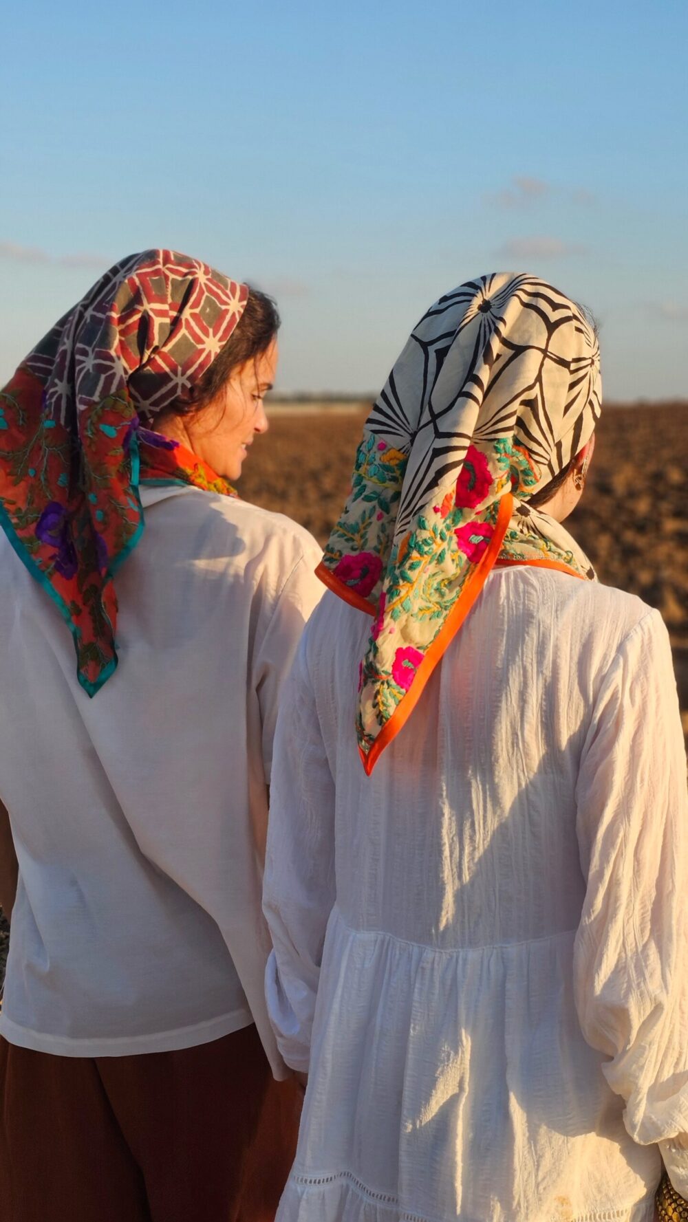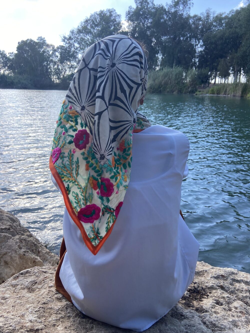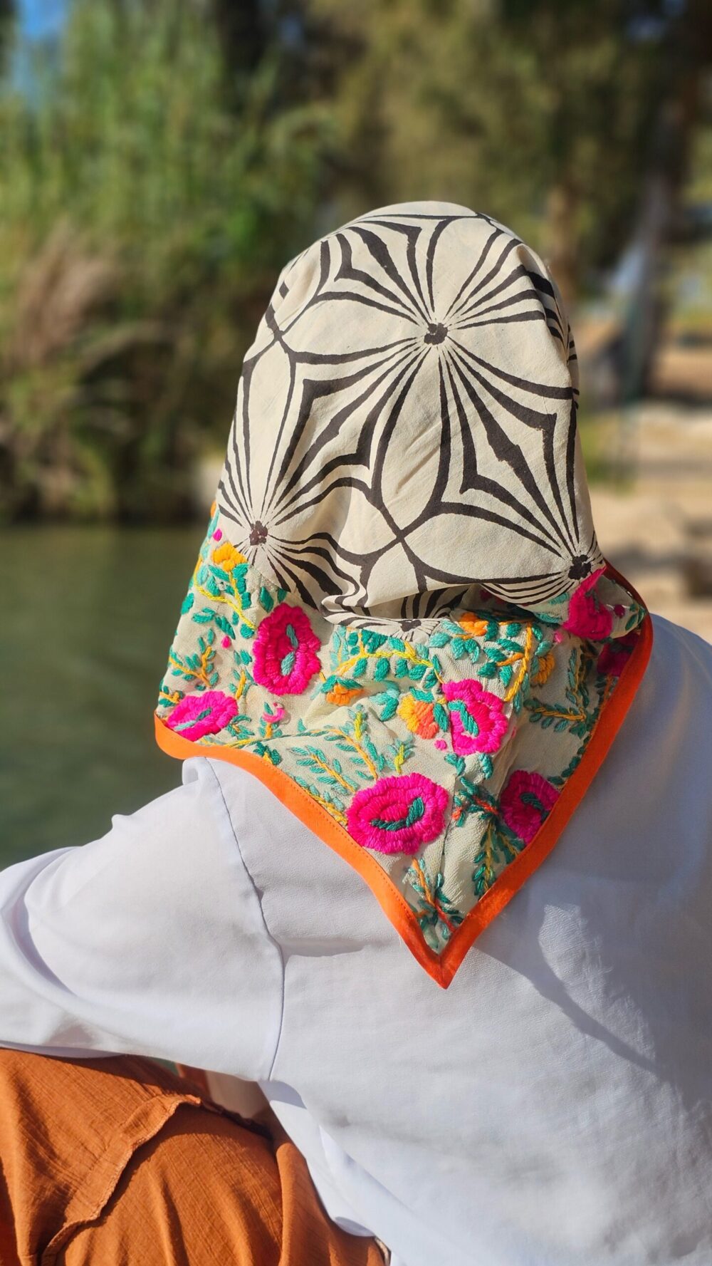 הבנדנה בצורת ריבוע, ובשתיים מהצלעות יש רקמה מהממת וסיום של סרט כתום.