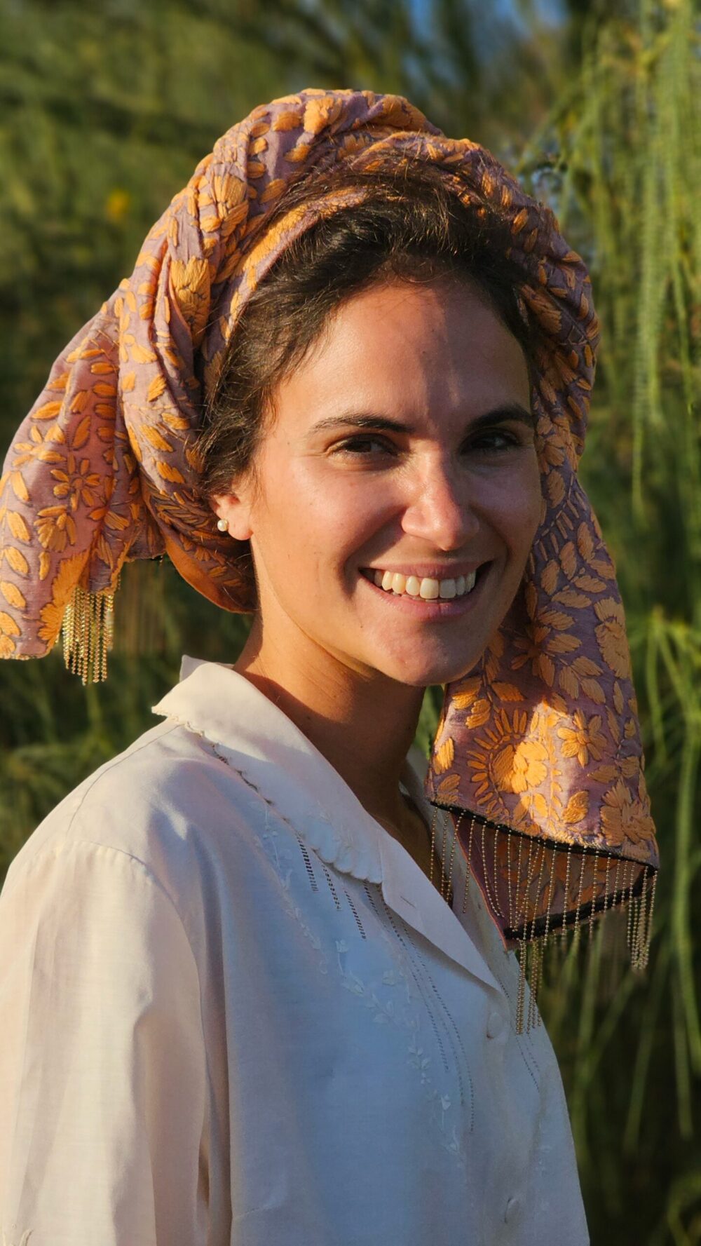 הפעם מה שכבש אותי זו הצבעוניות העדינה. הרקע של הצעיף בגוון סגול בהיר, ועליו רקומים פרחים בגוון אחד מהמם, בין כתום לצהוב עדין עדין.