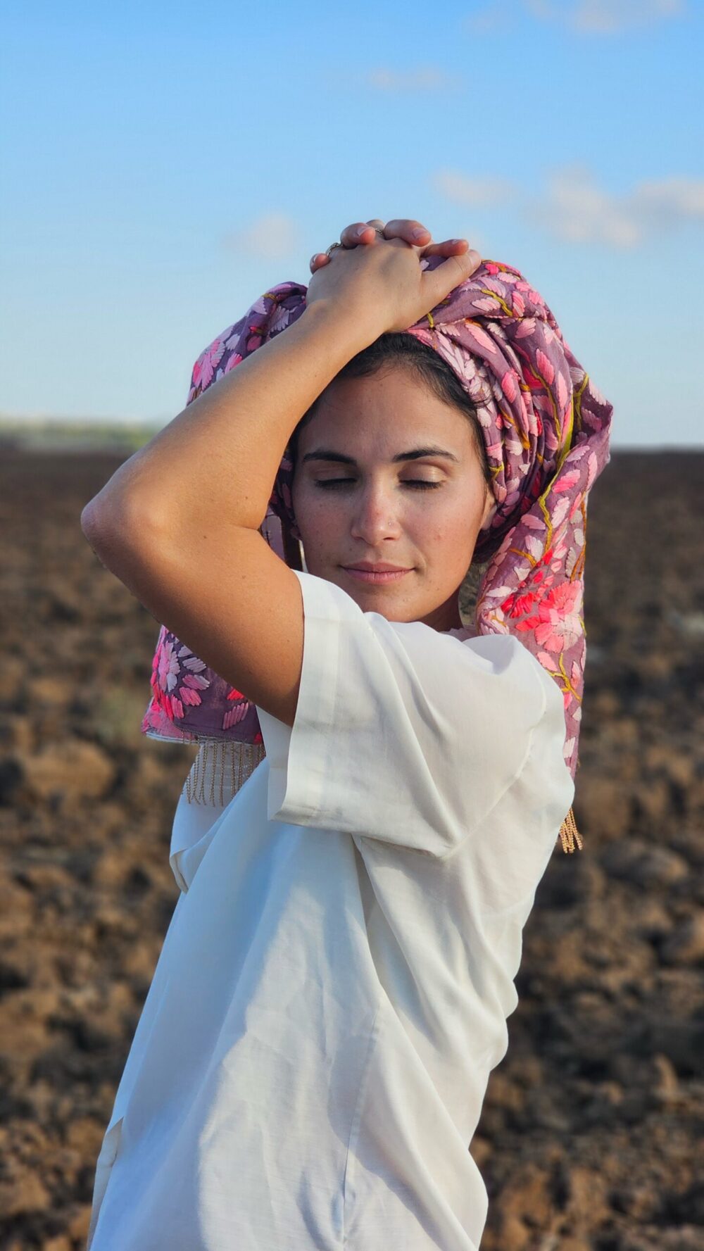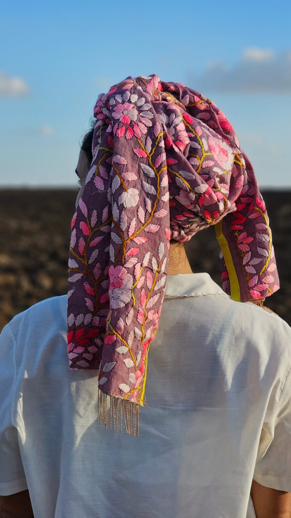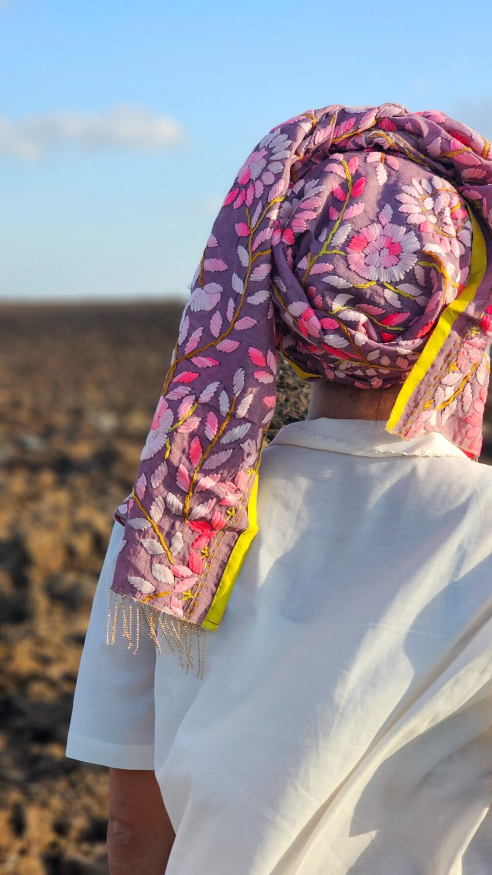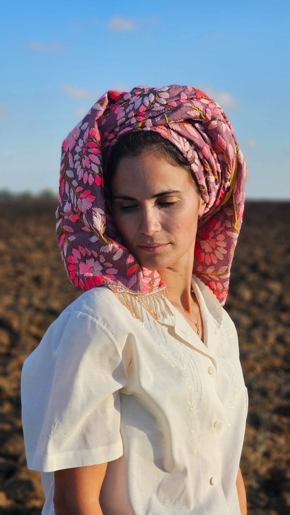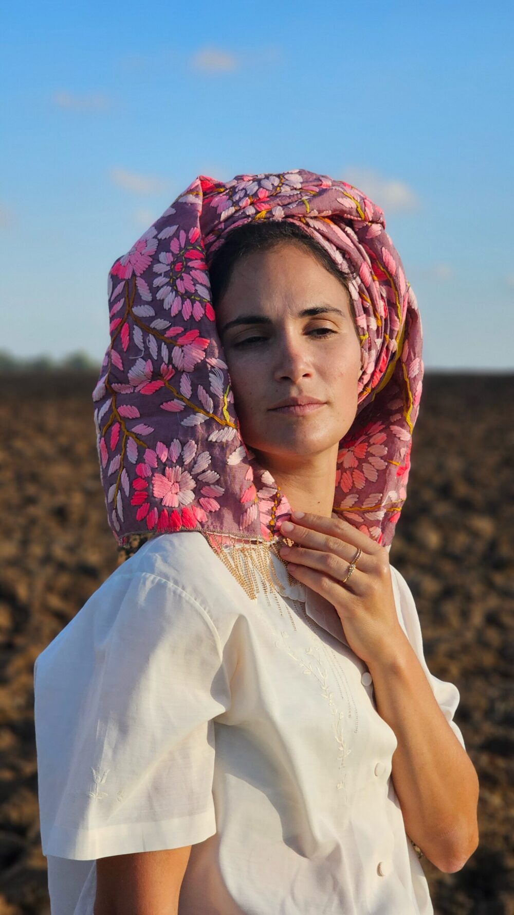 בכלה הזו על רקע סגול לילך, רקומים פרחים ורודים ולבנים עדינים, וסרט קישוט צהוב לאורך כל הצעיף שמקפיץ את ההופעה.